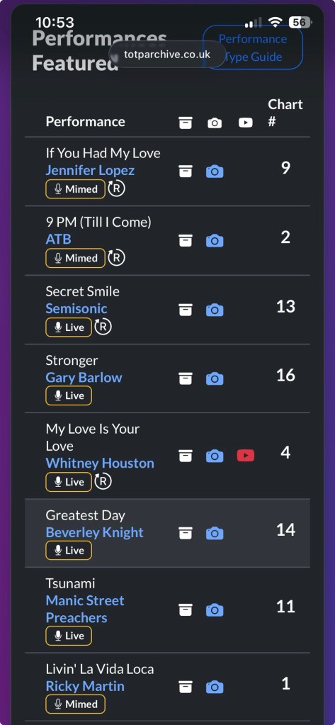 What I do know from watching this performance back though is that the TOTP studio audience didn’t seem to know how to dance to this one at all. There’s some collective shuffling about with one poor girl just stood there at the front of the throng, perhaps paralysed by the thought that any dance moves she attempted would be seen on national TV. Just a few people down the line however, one single girl took the exact opposite approach, seized the moment and went for it with arms and hips swaying in unison. Again, I didn’t know anything much about being a young woman in the late 90s but if I’d been in that audience, I’m pretty sure I’d have been the girl stood motionless.