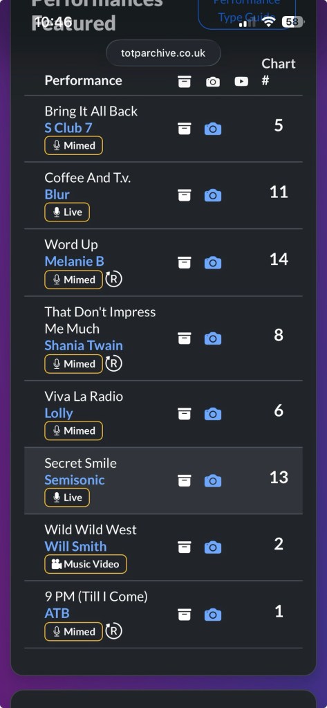 I would say that there’s only Blur’s “Coffee & TV” and “Secret Smile” by Semisonic that piqued my interest and I certainly had no desire to review S Club 7 and Shania Twain again and I could live without Lolly as well. As for the 16th July episode…